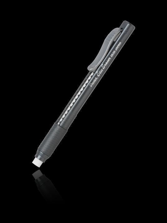 • retractable eraser • plastic body • practical design • comfortable grip • replacement eraser ZER-2 • black body color with plastic clip. The retractable eraser is housed in a practical plastic body. The polymer eraser is white. The plastic clip is equipped with a brake that prevents the eraser from extending to a length where it could break. The eraser can be refilled with replacement cartridge ZER-2. Comfortable grip and erasing thanks to the pen-like design.