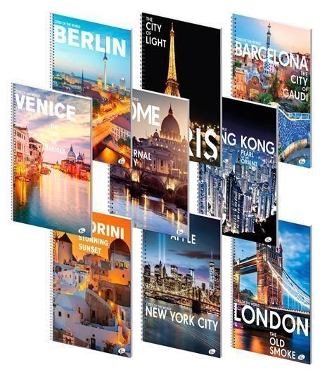 World metropolises captured in photographs form a collection of covers for high-quality notepads. Sturdy cover with a matte finish and glossy lacquered details, bound with silver double spiral. A4 block format, 70 sheets (70 g paper), lined. A total of 9 different designs. Packaging: 25 pcs.
