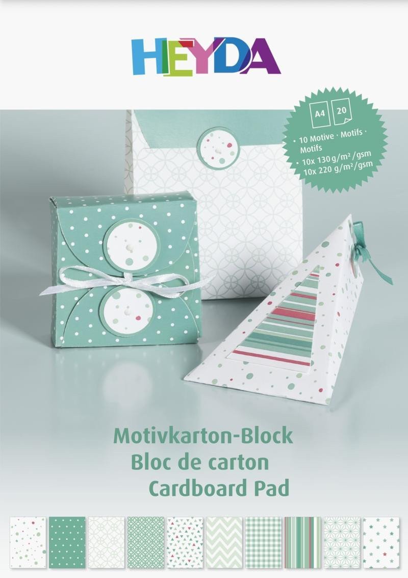 A block of colored papers, 10 designs in 2 weights, mostly printed on both sides. Paper weights 100 and 220 g/m2.