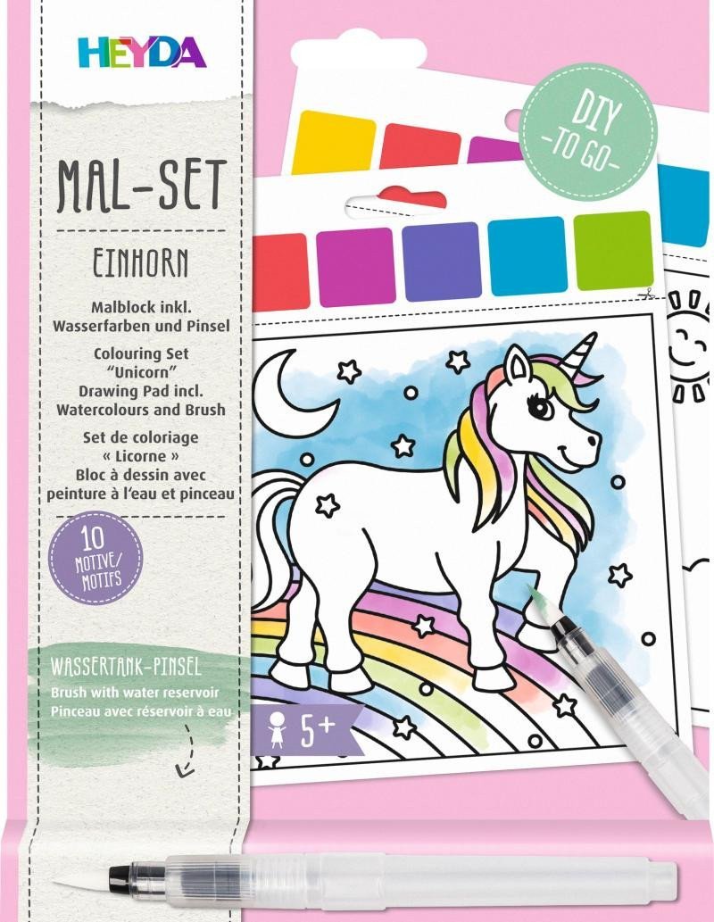 To paint, simply fill the included brush with water and dip it into the coloring pad. After painting, let the picture dry. Contents of the package: 6 coloring pads with water-soluble paint and a brush. 10 different motifs of unicorns, each measuring 15 x 13 cm. V
