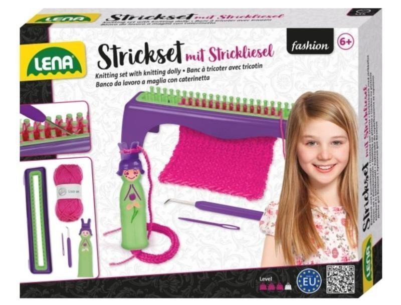Ein komplettes Set mit Strickwagen, Strickbank, Stricknadeln, einer Kunststoffnadel und farblich abgestimmtem Strickgarn. Entdecke deine kreative Seite! Verpackungsmaße: 30 x 24 x 7 cm. Geeignet für Kinder ab 6 Jahren.