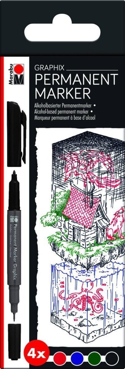 Marabu permanent marker 2 tips 05+1-2mm 4 pcs. Bright colors thanks to high-quality alcohol-based ink with low odor and quick drying (toluene/xylene-free). Waterproof and smear-resistant on many light surfaces, e.g. photographs, plastics, wood, stone, metal, and glass. Double tip (1.0 - 2.0 mm fiber tip and extra fine 0.5 mm plastic-covered tip). Cap with clip. Ideal for illustrations, sketches, final drawings, and much more.
