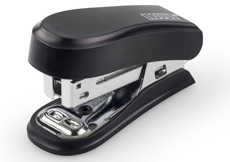 A handy stapler for every bag, including school bags. Metal stapler with a plastic base. Integrated metal staple remover. Top loading with easy staple guidance. Stapler length 6 cm. Maximum paper insertion depth 25 mm. Packaging includes 320 staples 24/6.
