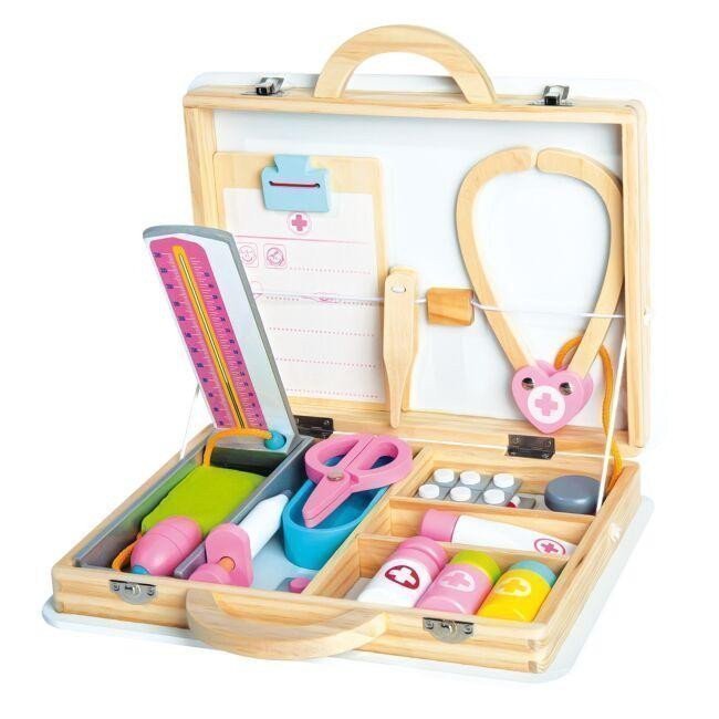 A wooden medical suitcase for little doctors. Ideal for role-playing, where children can play for a long time. They can explore the adult world and have a lot of fun while doing it. Children can easily open the suitcase themselves, take out the necessary medical tools, and pack it up again after playing. The extensive 16-piece accessory set is well secured with wide rubber straps. In a playful way, they train language skills, fine motor skills, and support their imagination. Children's fun helps reduce fear and anxiety about visiting the doctor. Suitable for children from 36 months. Warning: Use by children under 3 years only under adult supervision. Suitcase dimensions: approx. 29.5x25.5x6 cm.
