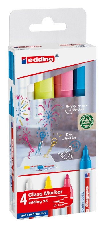 Edding 95 marker for all glass surfaces. The innovative ink offers excellent coverage - vibrant colors ensure that the mark is clearly visible even on colored glass. The marker can be used on glass, glass panels, mirrors, and whiteboards. A practical feature is the dry-erase capability - there's no need for a damp cloth. The ink dries quickly and leaves no greasy film. The marker is ready to use immediately - just remove the cap and write. It is especially useful for presentations, meetings, and for jotting down notes and ideas. It is also ideal for temporary messages on mirrors or for decorating windows. Set of 4 colors: white, yellow, pink, and light blue. The yellow and pink colors are fluorescent under UV light. Round tip. Line width: 1.5-3 mm. Cardboard packaging (90% FSC certified cardboard). Made in Germany.