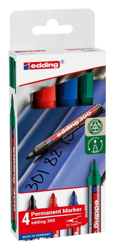 Edding 300 industrial marker, set of 4 pcs. A set of four colored permanent markers with a round tip width of 1.5–3 mm and low-odor ink. They are suitable for home and workshop use and write excellently on paper, cardboard, metal, plastic, glass, dry wood, and leather. The ink is quick-drying, water-resistant, wear-resistant, and smear-proof, and it does not contain toluene or xylene. The markers can be easily refilled with Edding MTK 25 ink (available in black, red, blue, and green). The set is packaged in a cardboard box made of 90% certified FSC cardboard.