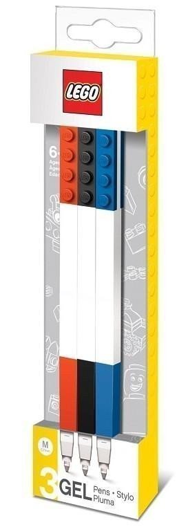 A trio of LEGO gel pens in different colors (red, blue, black). Each pen includes 2 LEGO plate strips for connecting to, for example, a LEGO pencil case, a minifigure, another pen, or snapping onto a LEGO ruler.