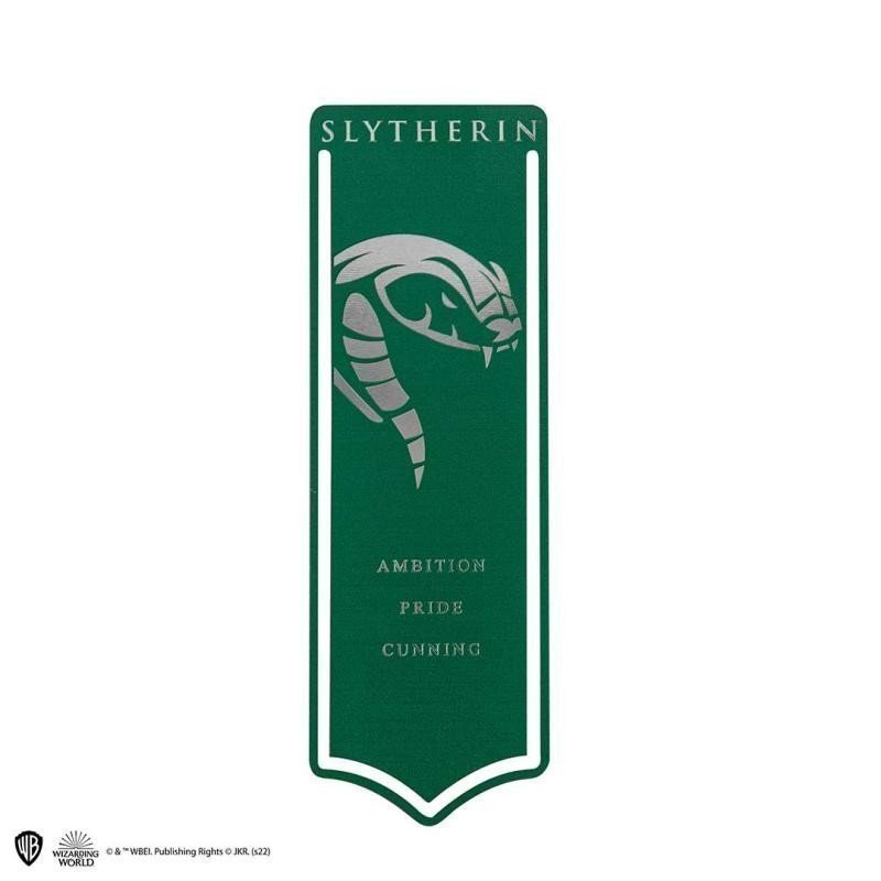 A metal bookmark featuring the Slytherin house motif. Dimensions: 16 x 5.5 cm.