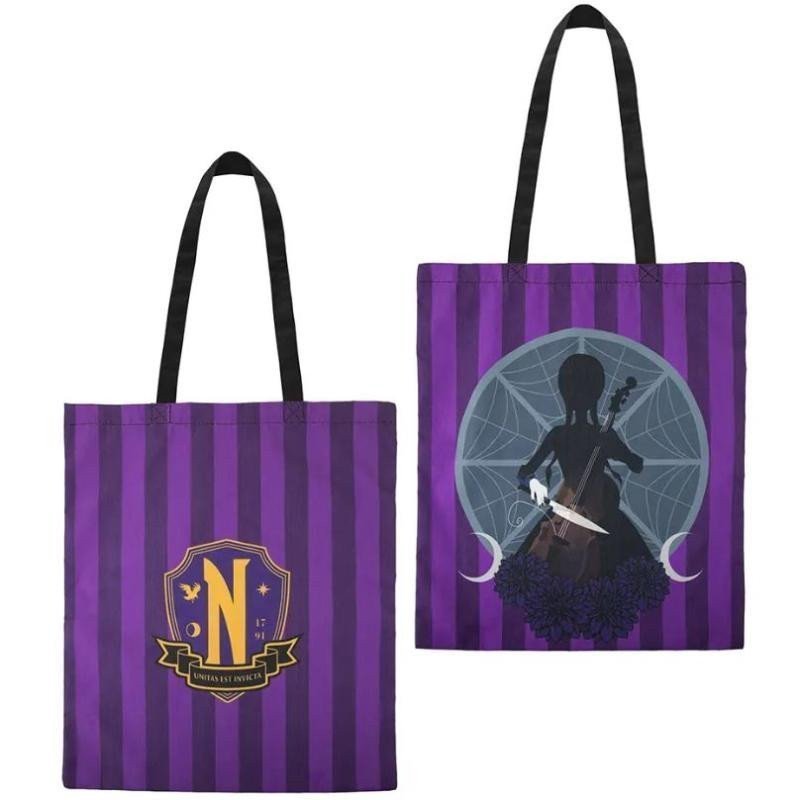 A canvas bag featuring a design from the world of Wednesday, officially licensed. Dimensions approximately 42 x 35 cm.