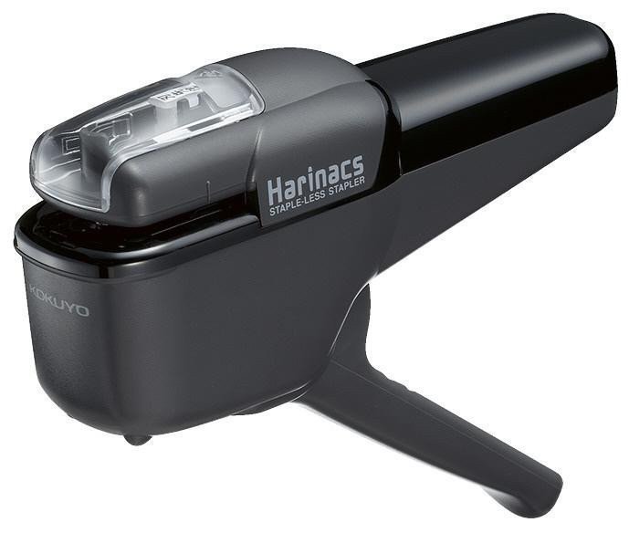 Practical KOKUYO Harinacs stapler - plastic body, black, environmentally friendly. When pressed, it punctures and binds with strong pressure, creating an oval hole. It can staple up to 10 sheets of 65-gram paper, comfortable grip, easy to press, packaged on a blister.
