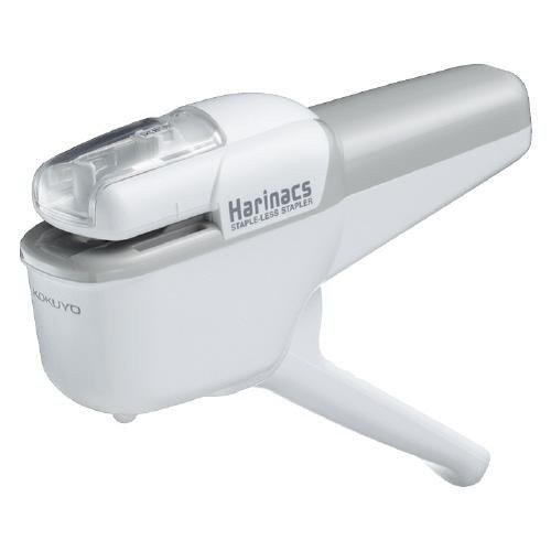 The practical KOKUYO Harinacs mini stapler features a plastic body, white color, environmentally friendly, and is wire-free. When pressed, it punctures and binds with strong pressure, creating an oval hole. It staples up to 5 sheets of 65-gram paper, has a comfortable grip, easy to press, and is packaged on a blister.