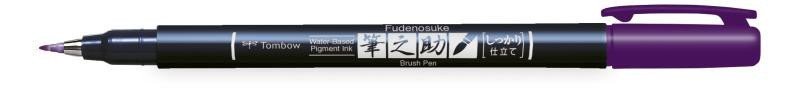 Fix Fudenosuke (brush pen) with an elastic brush tip (hard type). The line varies from thin to thick depending on the pressure applied to the tip. The Fix Fudenosuke with a hard tip is particularly suitable for writing small letters. Ideal for calligraphy, handwritten signs, sketching, doodling, and much more. The ink is water-based and odorless. Ink color: purple.