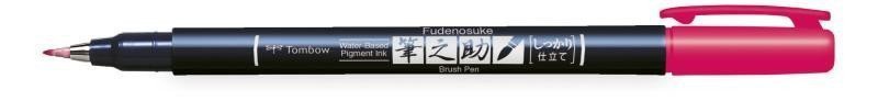 Fix Fudenosuke (brush pen) with an elastic brush tip (hard type). The line varies from thin to thick depending on the pressure applied to the tip. The Fix Fudenosuke with a hard tip is particularly suitable for writing small letters. Ideal for calligraphy, handwritten signs, sketching, doodling, and much more. The ink is water-based and odorless. Ink color: pink.