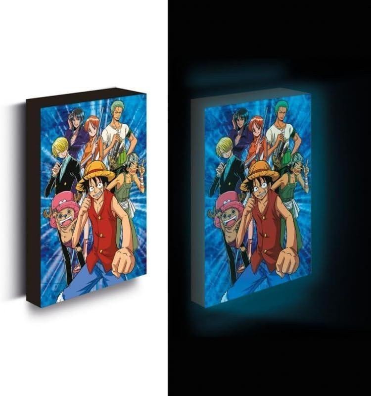 A glowing picture measuring 30x40 with a licensed motif from the One Piece anime. The light requires 3 AA batteries to operate, which are not included in the package.