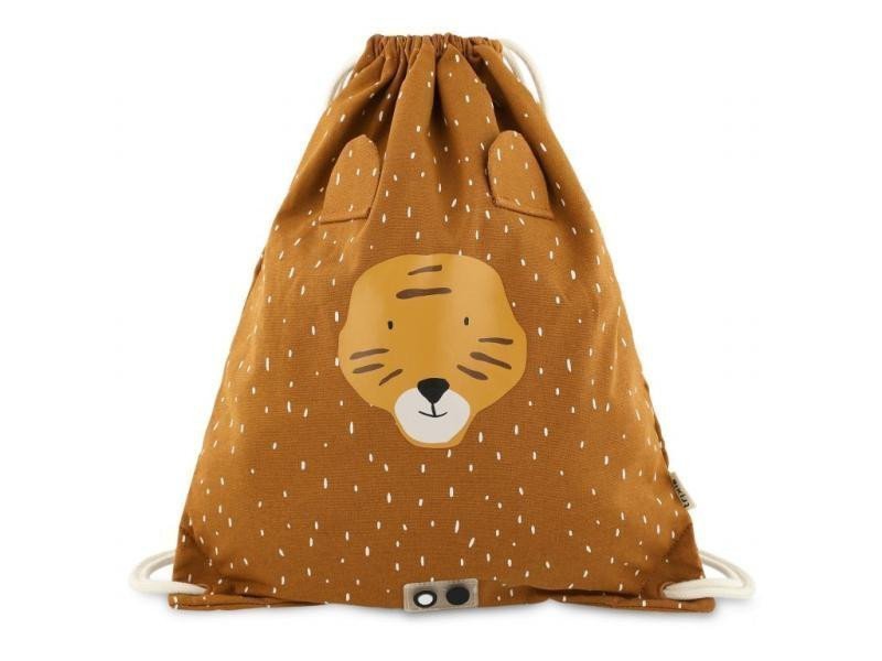 A fun and practical drawstring bag for gym class, slippers, or swimming gear. Material: 100% cotton. Lining: 95% cotton 5% PES. Size: 34 cm x 40 cm. Features: 2 practical drawstrings for easy opening and closing of the bag. Inner pocket for keys, money, or membership card. Water-repellent coating. Name tag inside.