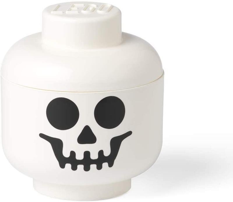 LEGO minifigure head-shaped storage box - skeleton. The iconic shape of the box can be used by children to store LEGO bricks, smaller toys, or even candies. Dimensions: diameter 240 x 268 mm. Material: polypropylene (PP). Made without the use of BPA, phthalates, and PVC.