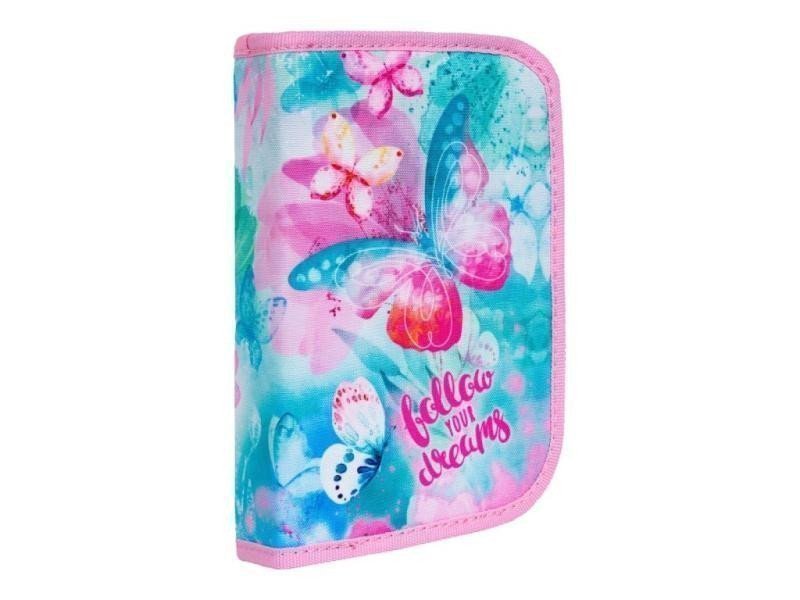 A foldable pencil case is an essential item for every schoolchild, as it can hold basic writing supplies and other small items. Thanks to the flaps with loops, everything is organized. The walls are reinforced, so all pencils and crayons are protected from breaking. The pencil case is sold empty.