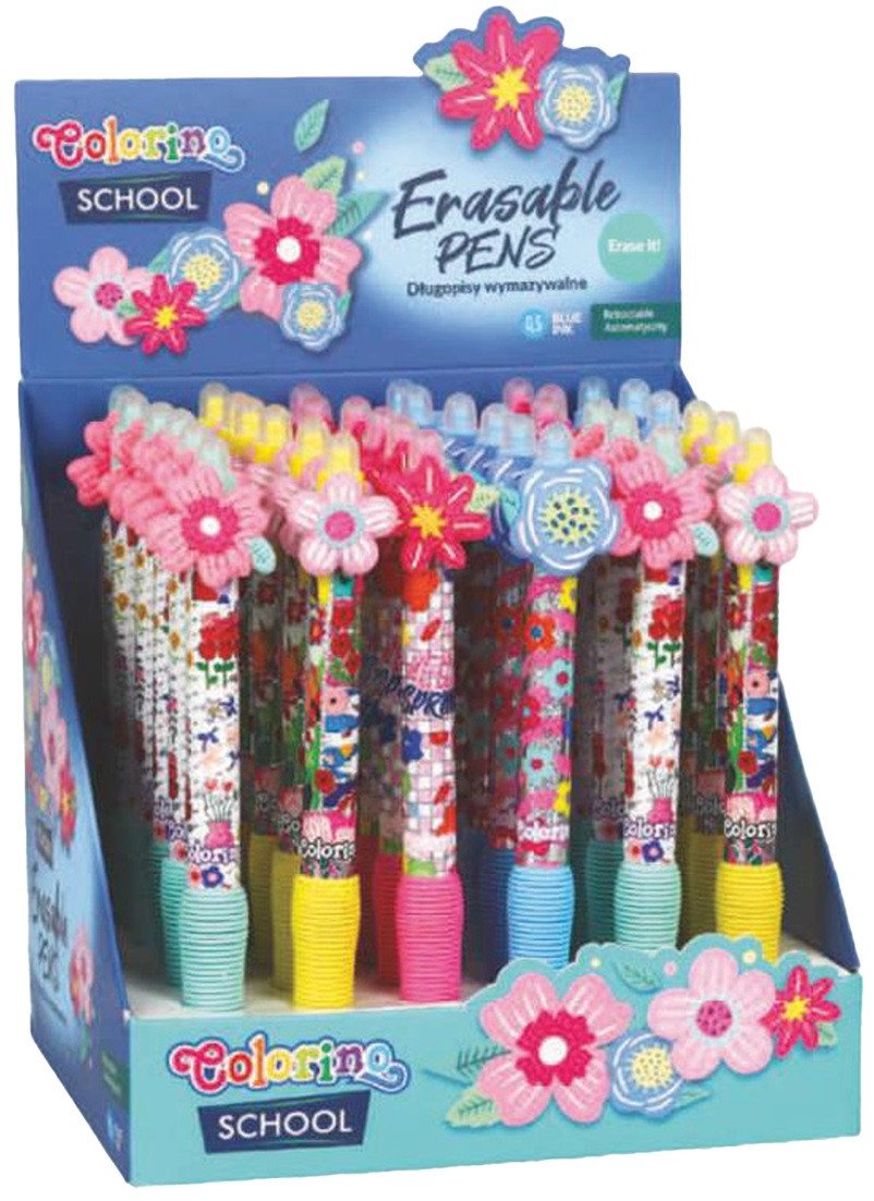 A collection of erasable pens with a colorful body and cute flower decorations. The pleasant rubberized grip ensures a comfortable hold for every schoolchild. • line width: 0.5 mm • ink color: blue • push mechanism in the clip • 4 flower designs • rubberized grip