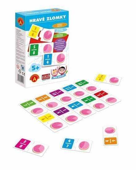 An educational game for children aged 5 and up, through which children learn about fractions in a fun way by matching fraction cards to the correct picture. The shape of the puzzle piece gives them a hint. The game naturally develops observational and combinational skills, trains perception, and is a great introduction to understanding fractions. BENEFITS: - Develops memory - Helps improve motor skills and concentration - Develops observational and combinational skills. The game is suitable for children aged 5 to 8 years. Package contents: 48 sturdy cardboard tiles with pictures, Czech and Slovak game instructions.