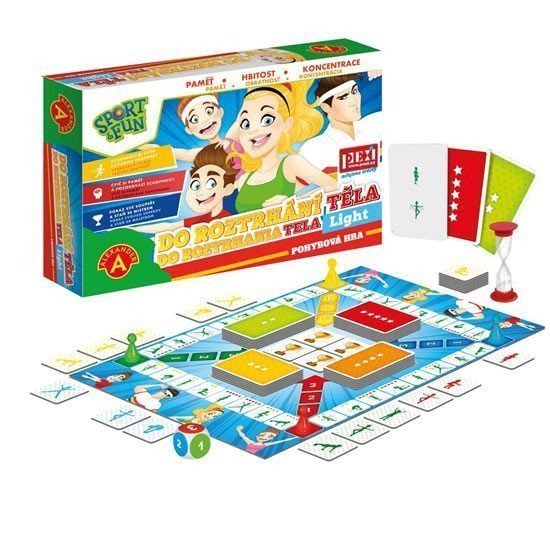 Sport&Fun - DO ROZTHÁNÍ TĚLA is an energetic game for 2-4 players aged 4 to 9, where players move around the game board, collect fitness tokens, but most importantly, perform physical exercises. Players compete not only against their opponents but also against their own bodies. The winner is the first player to assemble all the pieces of the puzzle from the fitness tokens. The game is suitable for both outdoor and indoor play. An energetic game for 2-4 players aged 4 to 9, where the task is to perform various exercises in a given order. The goal is to collect all the tokens for the individual exercises. The winner is the player who collects a set of eight tokens and the 'Winner's Cup' token. This game requires not only attention and good memory but also strength, movement coordination, and physical fitness. If players of different ages are playing, they can agree that older players will perform more exercises, for example, double the number of exercises shown on the card. Compete not only with other players but also with yourself! How do you earn a token for the puzzle and win the game? The board, for moving the pieces, contains spaces with star images (2 to 5) and icons of various physical activities. The number of stars on the space indicates which of the 4 types of exercise cards you will draw from the card decks. The more stars, the more exercises the set will contain, and the more challenging it will be...