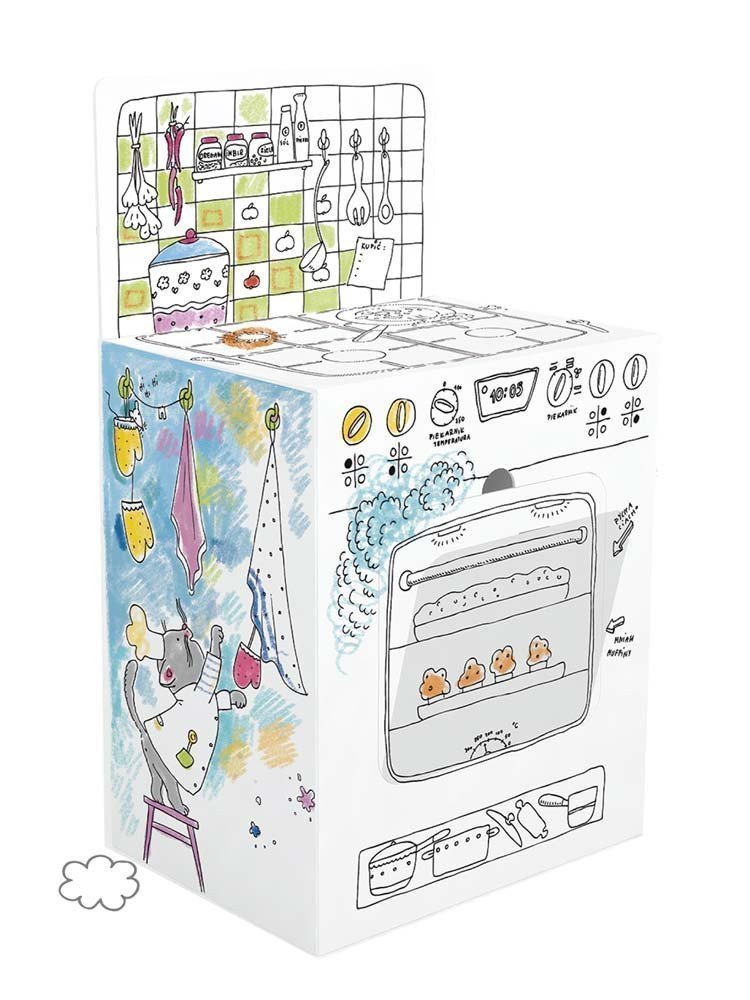 The stove is an original coloring toy for both girls and boys. It is robust and contains plenty of cheerful pictures that children can color and then assemble into a 3D model. It is made of strong and durable cardboard. The large pictures and cardboard are suitable for coloring with crayons, wax crayons, markers, or paints. The opening oven and the overall height of the stove at 75 cm allow children to play as real chefs and provide lots of fun. Height: 75 cm