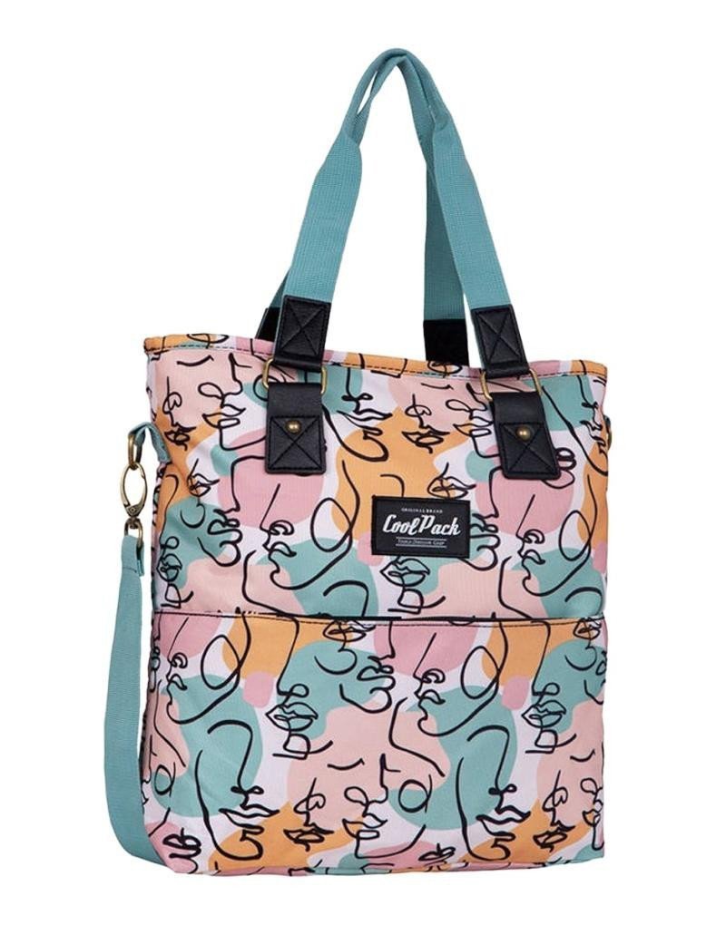 A cheerful and colorful shoulder bag suitable for everyday use. A unique design of abstract face shapes depicted on a soft colored background.