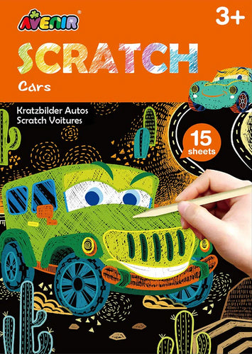 A fun mini book of scratch pictures for travel! 15 fun scratch-off pages full of cars - ready to be revealed using a special scratching tool. Simply scratch the black film to uncover the colors!