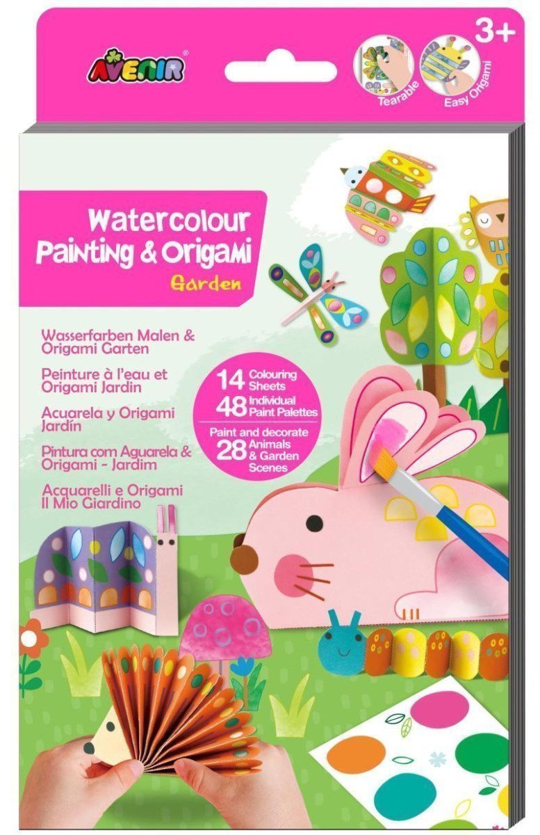Origami und Aquarellmalerei. Inhalt: 14 Ausmalbilder, 48 Farbpaletten, Pinsel. Alter: ab 3 Jahren. WARNUNG! Erstickungsgefahr – Kleinteile. Nicht geeignet für Kinder unter drei Jahren.