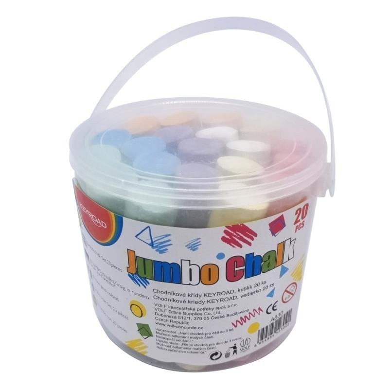 JUMBO sidewalk chalks are very easy to grip due to their thicker body. Size of chalk is 10.5 x 2.4 x 2.2 cm. Packed in a transparent box with a practical handle for easy transport. The bucket contains 20 pieces of chalk in yellow, green, red, blue, and white.