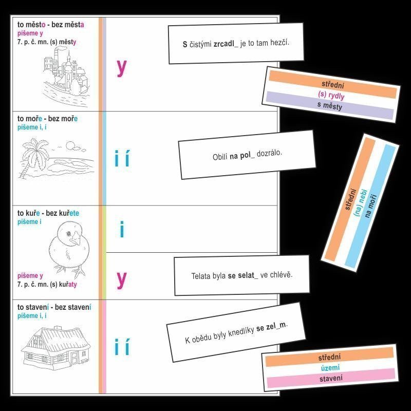 Koncovky podstatných jmen - kartičky k procvičování psaní I, Í, Y, Ý v koncovkách podstatných jmen