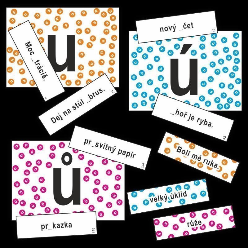 160 Karten mit Sätzen zum Üben des Schreibens von u/ú/ů. Enthält außerdem 1 Set Matten – Vokalmatten u-ú-ů.