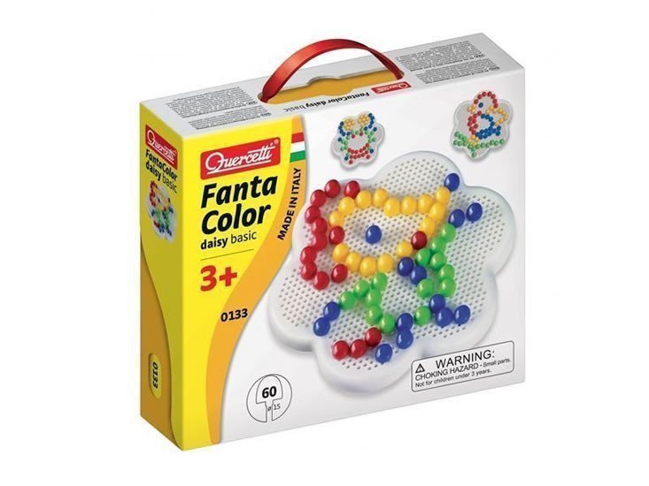 The mosaics develop fine motor skills, creativity, and imagination in children. They consist of a perforated game board made of soft, flexible plastic and a container of colored pegs with heads in various colors, sizes, and quantities. Using these pegs, which are inserted into the holes in the game board, children create various pictures or patterns. After the game, the pegs can be stored in the container to prevent them from getting lost. Made from top-quality plastics.