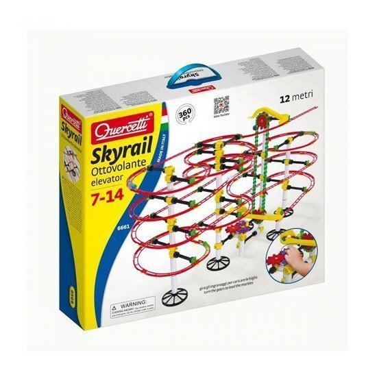 With the Skyrail Ottovolante Elevator, you can create amazing suspended parabolic tracks up to 12 meters long. The special elevator allows you to gradually release up to 10 marbles with a diameter of 19 mm (included in the package), or marbles of different diameters or materials (not included) and observe and explore physical phenomena such as acceleration, gravity, centrifugal force, or friction. Suitable for children aged 7 and up.