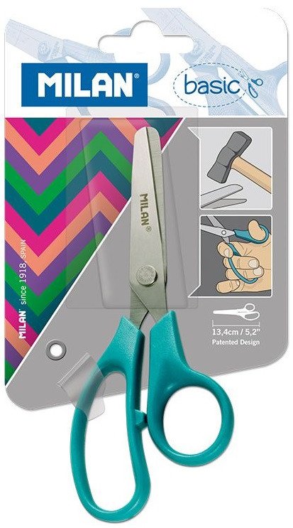 MILAN basic scissors, plastic ergonomic green handle, stainless steel blade, safe rounded tip, suitable as school scissors, total length of the scissors 13.3 cm, packaged on a blister.
