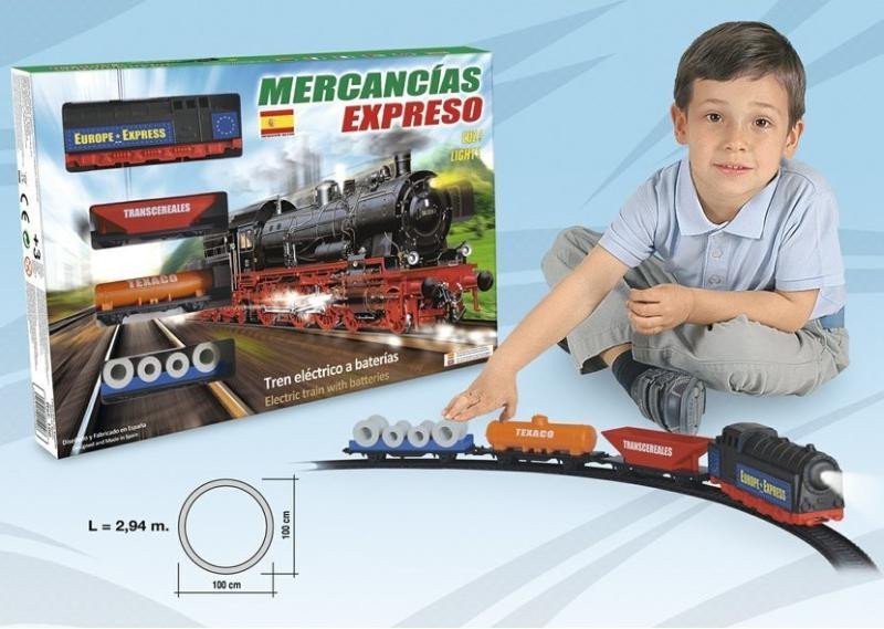 Battery-operated freight train with lights and 3 types of freight wagons, running on a track 2.94 m long.