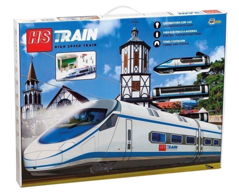 A metal battery-powered high-speed train consisting of a locomotive with light, two wagons, and a rear locomotive without a motor. The train runs on a track 5.7 m long. The set also includes a station, a tunnel, and a track switcher – a tool for easier placement of the train on the track. ***** Package contents: * 1 locomotive with light and motor * 2 wagons * 1 rear locomotive (without motor) * 11 straight tracks * 16 curved tracks * 1 station * 1 tunnel * 1 track switcher * 1 sheet with figures. ***** Requires 2 batteries 1.5 V (type AA – LR-6M), BATTERIES NOT INCLUDED.