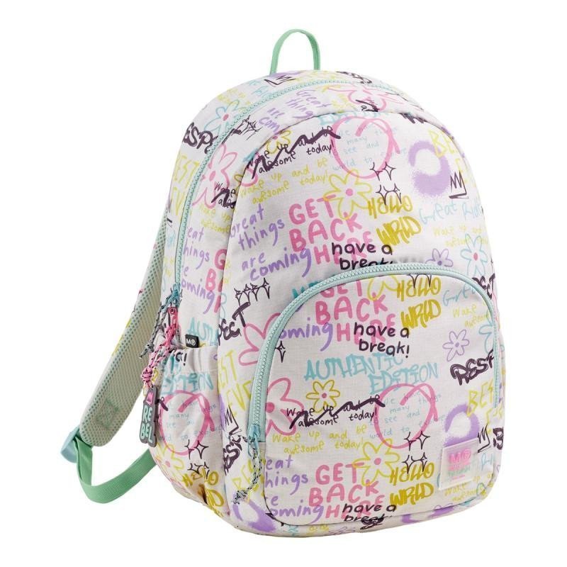 A modern, lightweight backpack in a soft color pattern designed for beginner teenage girls. The division into two pockets provides ample space for school and personal items. The recycled durable material extends the life of the backpack, and reinforced supports at the bottom protect it from damage and dirt. •dimensions: 400 × 280 × 160 mm •material: recycled polyester (rPET) •2 zip pockets, mesh pocket for small items •2 open side pockets for bottles