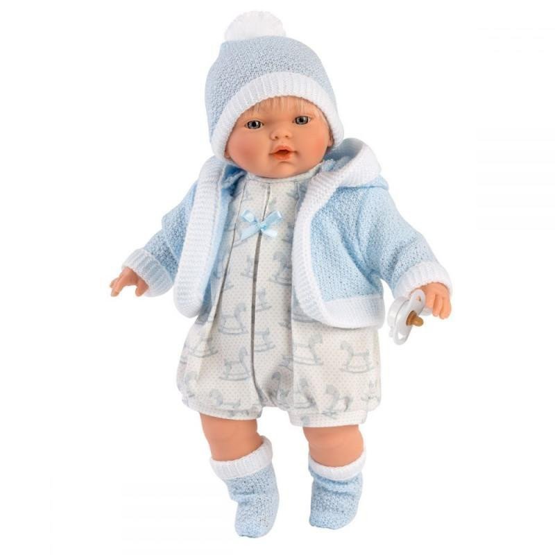 Talking doll with a soft fabric body and hair all over the head. When the pacifier is pulled from its mouth, the doll starts saying "mama", "papa" and makes the real sound of a crying baby. The doll can be soothed with the pacifier. Size 33 cm. The package includes 3 x LR44 button batteries. ***** The price includes a recycling contribution of 1 CZK excluding VAT.