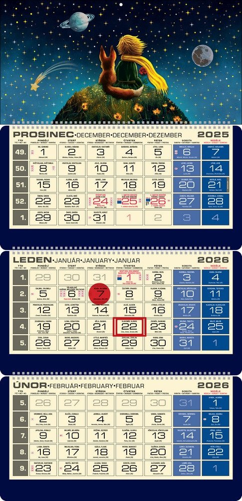 Timeless design inspired by The Little Prince, complemented by 3D varnish and elegant embossing. A luxurious three-month calendar featuring names in Czech and Slovak, names of months and days in four languages, a practical marker, and an overview of EU holidays.