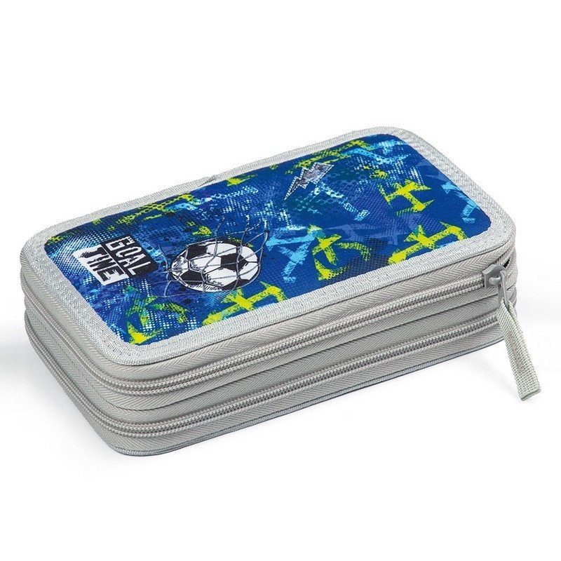 Two-tier school pencil case with a GOAL TIME motif. The pencil case offers two storage spaces for writing utensils and other school supplies. Both tiers close with zippers that have loops for better handling.