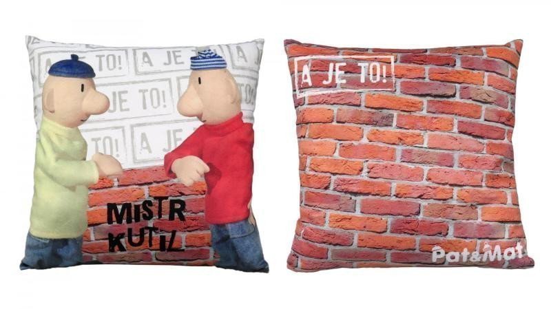 Soft pillow with double-sided print featuring the beloved DIY characters Pat and Mat. Suitable for a crib, travel, or as a decoration in a child's room. Material: microvelour, image print, filling: hollow fiber. Washable at 30°C, 100% polyester. Handmade in the Czech Republic. For children of all ages.