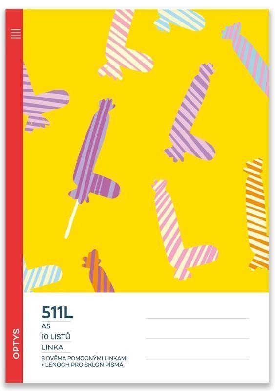 We present a novelty that you won't find anywhere else. The updated OPTYS notebooks are even better! The shading on the cover suggests that a lazy bone is a permanent feature that will never get lost. You can find it on both sides of the notebook. Just use it to support the page you are working on. Everything is quickly ready for writing, and the student can easily maintain the slant of their handwriting. This A5 notebook has a line width of 20 mm. It is intended for first and second graders who are learning to write. It is assisted by two helper lines that allow them to focus on the shape and size of the written letters. The notebook contains 10 sheets and features a candy motif in the shape of an L. This OPTYS school notebook, like the entire range, was developed in collaboration with graphic designers and the most qualified experts – teachers. As a result, it is maximally functional. It also has a modern design that students will like. From the pictogram on the spine and the cover of the notebook, you can immediately see the number, format, number of pages, and whether the notebook is blank, lined, or squared. And whether it includes a lazy bone. Czech production at our Optys printing house guarantees top quality and product availability.