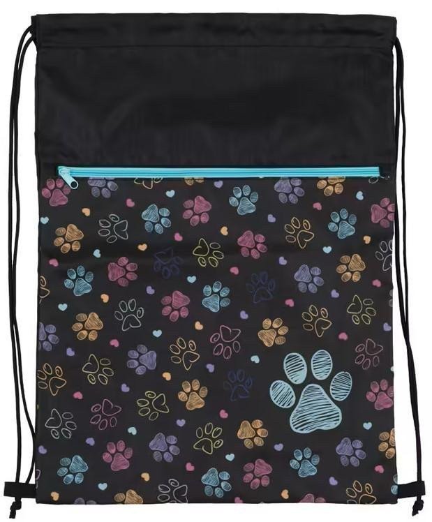 School bag for slippers and gym shoes suitable for 1st grade elementary school students. The school bag is made of durable and high-quality material. Bag dimensions: 440 x 320 mm. Water-repellent sturdy material keeps items dry. The zip pocket separates shoes from other clothing. The drawstring connected to the bottom transforms the bag into a small backpack. The school bag is a practical accessory for a school backpack for storing gym shoes or PE items.