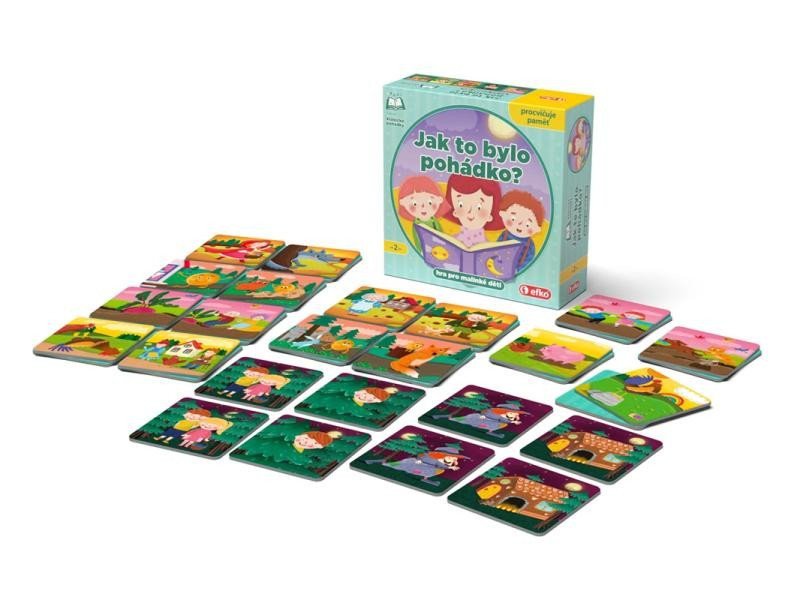 Can you recognize the fairy tale from the pictures on the card? Can you find all the images that belong to one fairy tale? On 40 sturdy large cards, scenes from five different fairy tales are depicted, with which you can play simple games. Charming illustrations by Lucie Charvátová. Made in the Czech Republic.