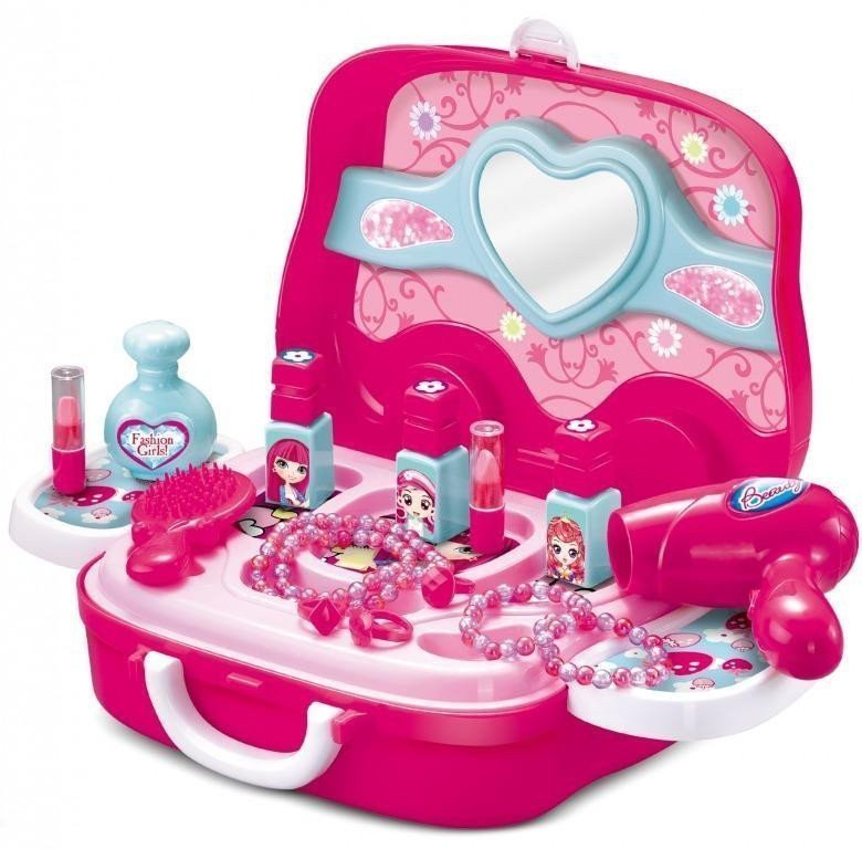 Pink cosmetic case that includes a hairdryer, makeup, nail polishes, combs, and lots of jewelry. Age 3+ Dimensions: 26×21×9 cm Batteries: 3× AA not included