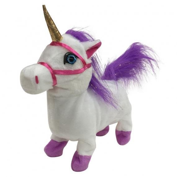 The unicorn can move forward or stay still while making sounds, moving its head and tail. Recommended age: 3+ Batteries: 4× AA, not included.