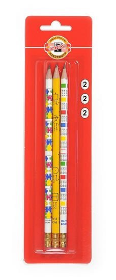 Round pencils in a wooden casing with a graphite core graded no. 2/HB. The pencils come with an eraser tip and are packaged in a blister of three. The print on the pencils features designs: puzzles, a small multiplication table, and formulas, making them suitable for all schoolchildren.
