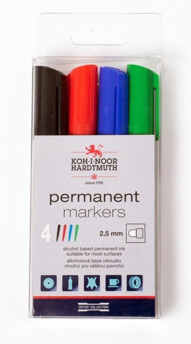 Permanent markers filled with alcohol-based inks, in red, blue, green, and black. The ink is resistant to abrasion and water. They are designed for marking non-porous materials (metal, glass, porcelain, leather, wood, concrete, stone, cardboard). If necessary, the marking can be removed with alcohol. They are equipped with wedge tips with a diameter of 5 mm and can write with a line width of 2.5 mm, with a length of 600 m. Packaged in sets of 4 pieces in plastic boxes.