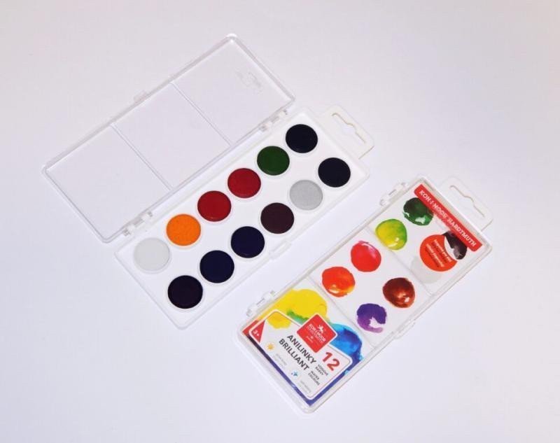 Watercolors with a tablet diameter of 22.5 mm featuring 12 brilliant shades suitable for special artistic techniques, such as photo coloring, portrait painting, painting on decorative items, decorating Easter eggs, etc. Packaged in a plastic palette with a transparent lid.
