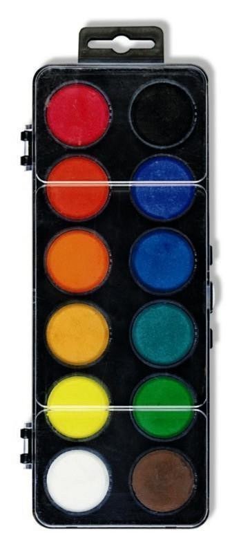 School watercolors in 12 shades with tablets measuring 30 mm in diameter, in rectangular, plastic, single-layer palettes with a transparent lid. The colors are vibrant and characterized by their high pigment content. They are certified and completely safe for children.